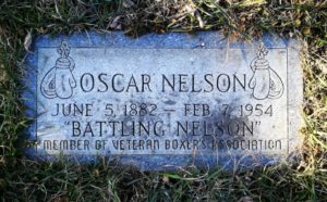 Tankerne om, at min søgen mindede om at lede efter en nål i en høstak var så småt ved at indfinde sig. Men pludselig fangede mit øje “Oscar” på en lille uanseelig sten i græsset. Der var den! Oscar Nelson stod der, omgivet af tegnede boksehandsker, med fødsels- og dødsdato samt det navn han benyttede som aktiv bokser: Battling Nelson. Ved siden af lå desuden en mindesten for hans kone Edna, som var død året før.